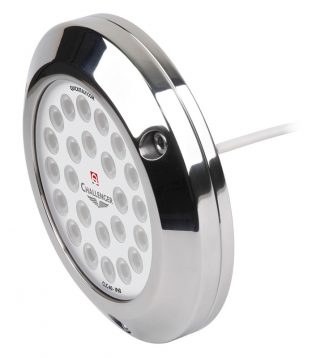 LED light for underwater installations IP 68 high brightness (107 lumen per watt) AISI 316 s/steel cool white or blue light. Special prescriptions for devices to be employed in swimming pools and similar uses. Lighting devices: EN60598-2-18. Installation below the waterline