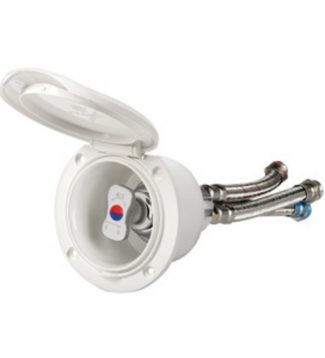 Plastic and chromed brass lever-operated shower head. The water system opens and activates the fresh water pump by pushing the button. It prevents using an intermediate locking faucet. Designed for deck mounting.
